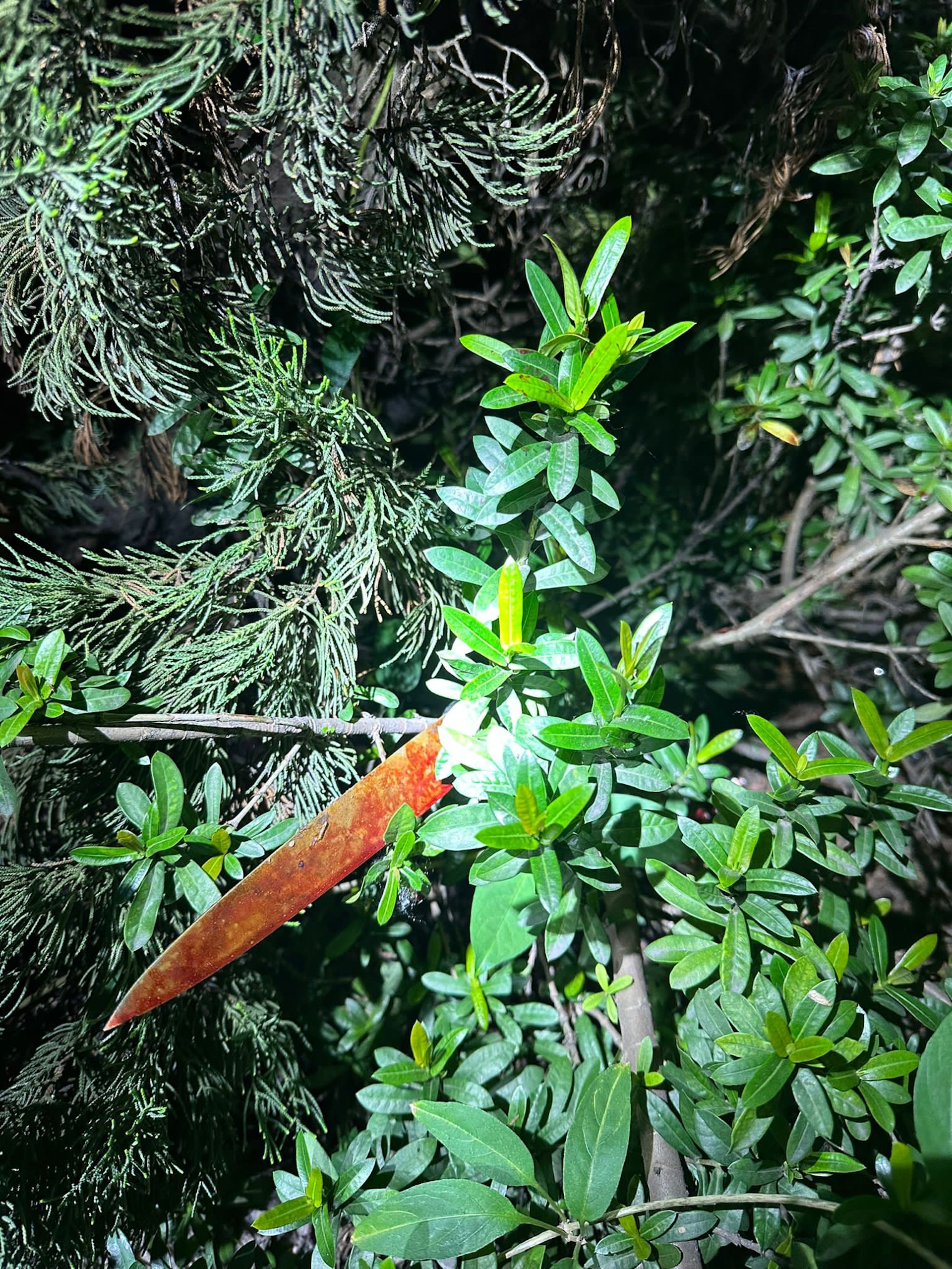 另外人員於現場附近草叢發現染血電鋸及利刀。