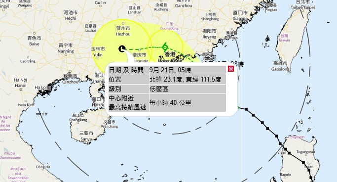 依照天文台最新的熱帶氣旋路徑圖顯示,熱帶風暴「米娜」目前已進入距離香港約180公里範圍,預計在今日黃昏時分於廣東沿岸登陸,並於9月20日凌晨自香港北面約100公里位置掠過。
