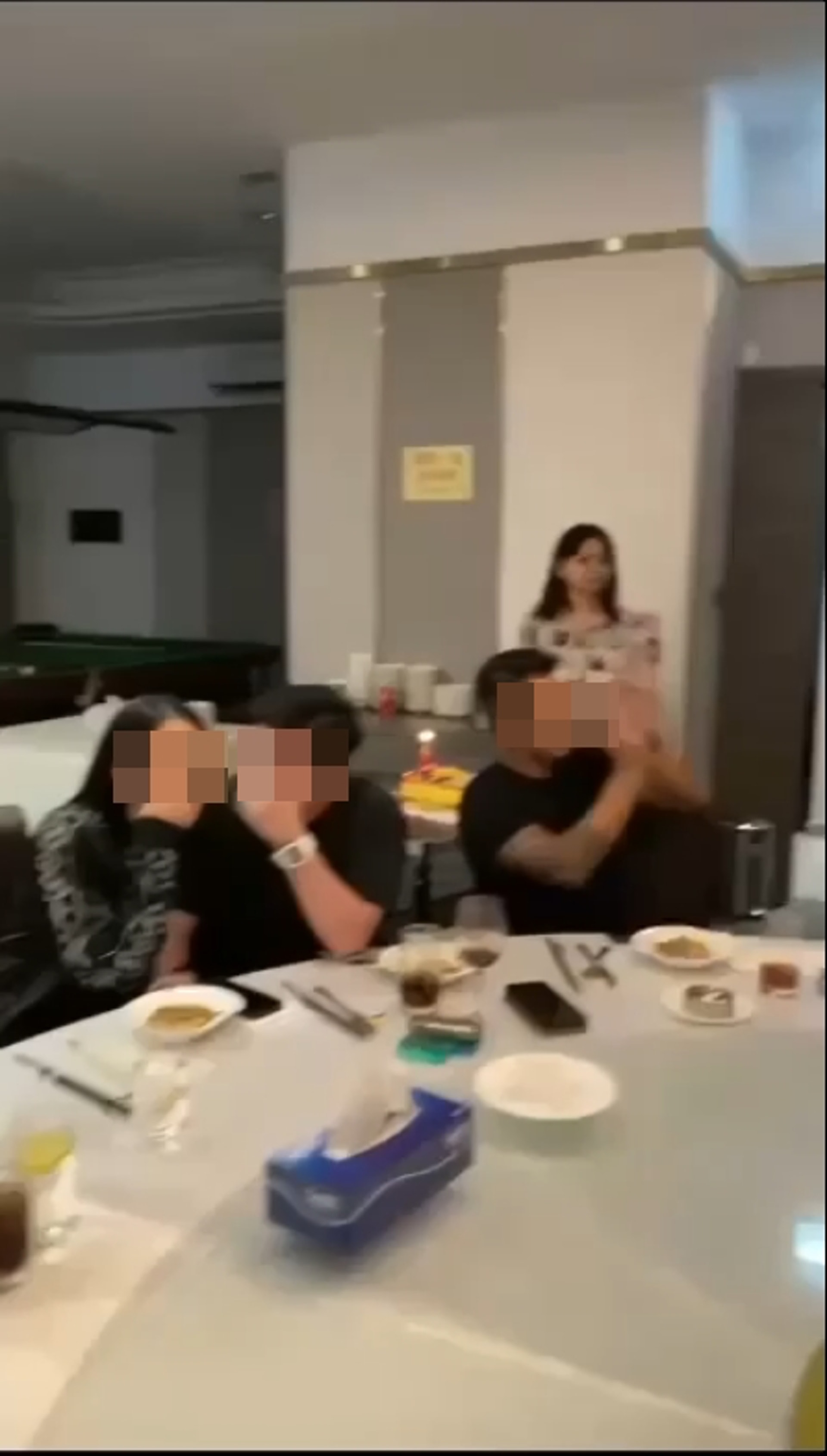 據現場影片顯示,阿儀身穿黑裙白鞋,推着蛋糕車步入廳房,全場隨即鼓掌喝采,場面熱鬧。有人半開玩笑大喊「口哥錫啖啦!」,亦有人調侃「阿嫂你介唔介意?」。壽星「左口」則笑逐顏開,並與阿儀一同合照留念,背景響起生日歌。